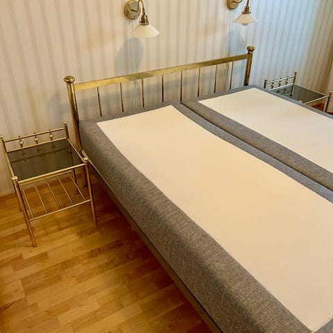 Siisti ja hyväkuntoinen Kustavilainen parisänky 160 x 200 cm väriltään helmenharmaa kulta ja kaksi yöpöytää. Kuvan kolme ja neljä maalipinnan lohkeamat ovat ainoat silmällä havaittavat viat.