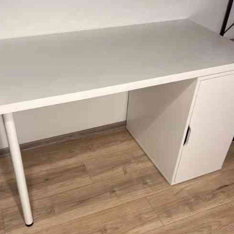 Valkoinen työpöytä metallisilla jaloilla ja piuha kourulla. Muutamia jälkiä, muutossa tulleet (näkyy kuvissa)