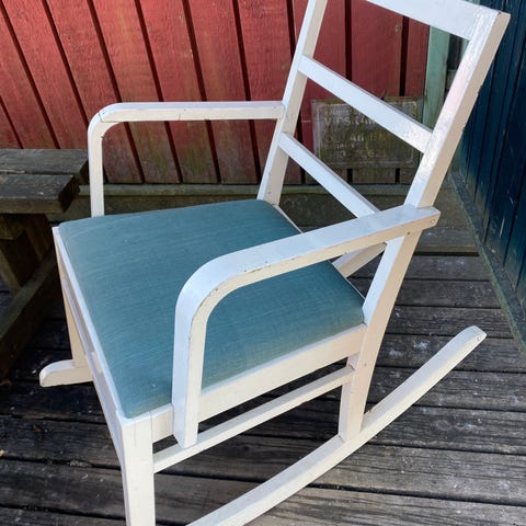 Kaarevasti muotoiltu istuin on kunnostusta vailla. Alin rima on irronnut, mutta tulee mukaan.