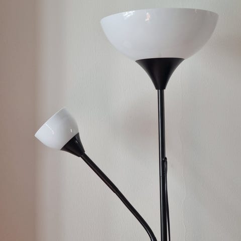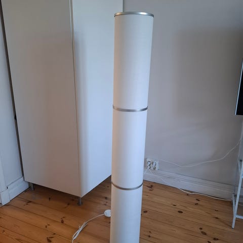 Ikean (merkki unohtunut) lattiavalaisin kahdella säädettävällä kohdelampulla. Ei taida enää löytyä mallistosta. Ohutkantainen kierrelamppu max 7W. Valaisee hyvin ja säädöt ym toimii kuten ostettaessa. Varjostimet muovia, ei kellastumia. Runko kevyttä metalliseosta.