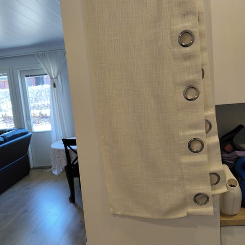 Raidalliset verhot, materiaali 100 % puuvillaa. Metalliset purjerenkaat kiinnikkeinä.