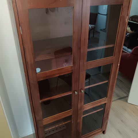 Upea rottinkikaappi. Puuta/rottinkia, messinkivetimet ovissa. Sisällä 2 tasoa. Muuten kunto moitteeton, toisessa ovessa ollut uudesta asti kehys alaosasta ovessa hiukan kiero. Fiksaten saanee suoristettua, kts viimeinen kuva.