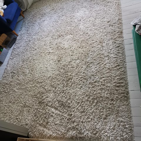 Iso valkoinen karvamatto nyt edullisesti pois nurkista pyörimästä. Muutama läikkä näkyy kuvissa, saattaa lähteä pois putsaamalla.