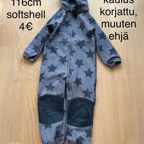 Tummansininen IELM softshell-haalari koossa 116. Ehjä haalari siistissä käytetyssä kunnossa, resoreissa pientä tummentumaa.