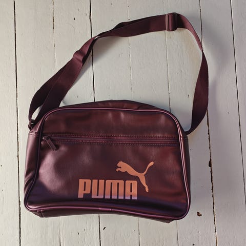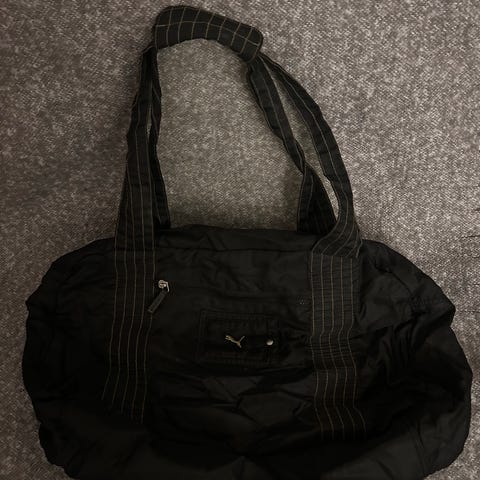 Puma laukku unisex-käyttöön. Materiaalina musta tekonahka, jossa suuri Puma-logo edessä. Laukussa on kaksiosainen kantokahva sekä säädettävä ja irrotettava olkahihna. Pääosasto suljetaan vetoketjulla. Sopii esimerkiksi urheilu- tai viikonloppulaukuksi sekä yleiseen arjen käyttöön, kun tarvitaan tilavaa kantovälinettä. Koko 45x32cm. Erittäin tilava.