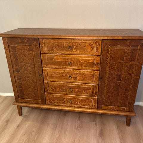 Tukeva, ollut kirjahyllynä. Kaappiosassa kaksi alkup. hyllyä. Lasit ajan saatossa hukkuneet.