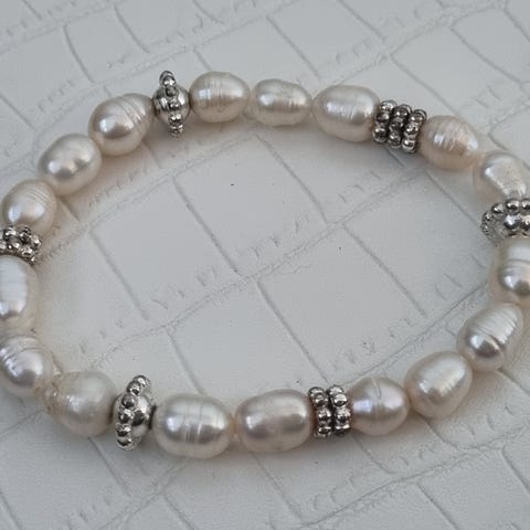 Hyväkuntoinen kierteinen helmirannekoru. Halkaisija noin 6cm.