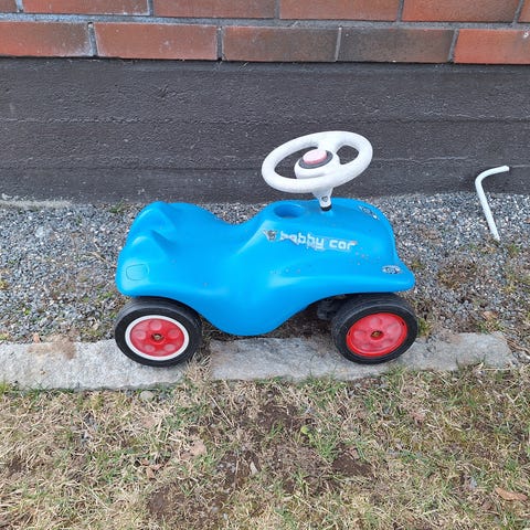 Punainen muovinen ajolelu, jossa neljä pyörää ja valkoinen ohjauspyörä.