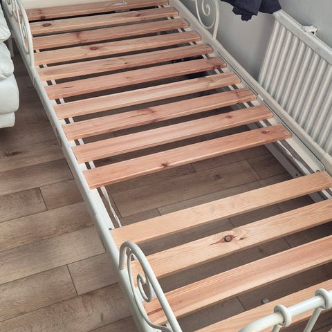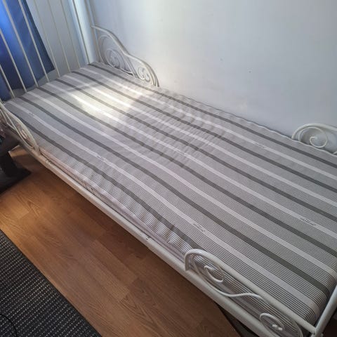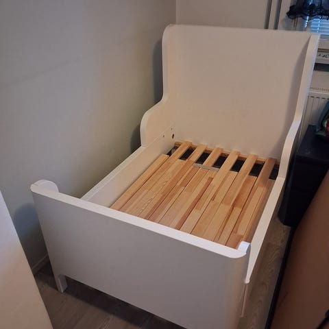 Valkoinen lasten sänky, jonka voi jatkaa lapsen kasvaessa. Kulumaa reunoissa. Patjat saa mukaan halutessaan.