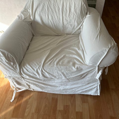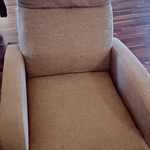 Kaksi samanlaista vanhaa nojatuolia, kankaat ja jouset ehjät. Kuvan istuinryijyt saa mukaan.