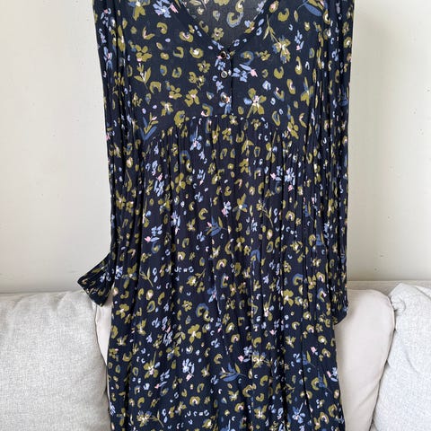 Kukkakuvioinen, hihaton kesämekko, jossa on V-kaula-aukko. Koko 36, valmistettu viskoosista ja puuvillasta.