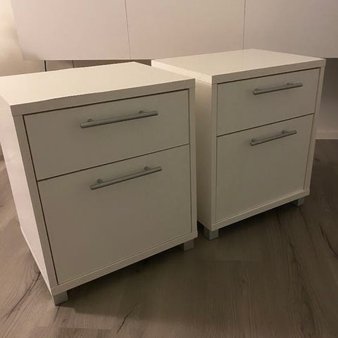 Kuvan hyväkuntoinen valkoinen, laatikollinen yöpöytä.