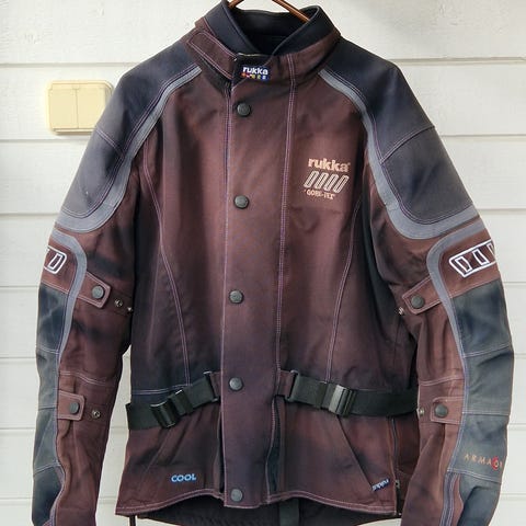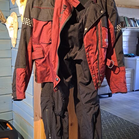 Rukka Gore-Tex ajotakki ja -housut irroitettavalla lämpövuorella. Suojat paikoillaan vetoketjullisissa taskuissaan.