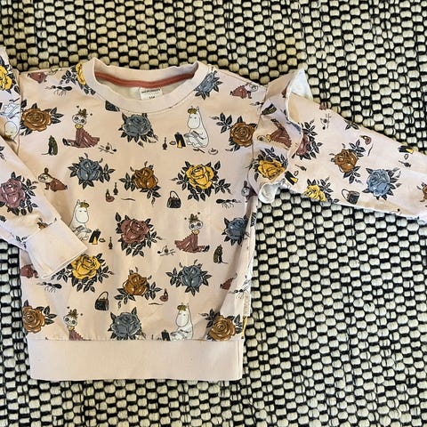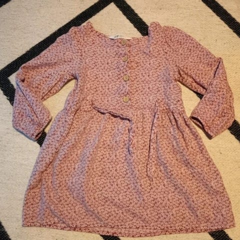 Papun mekko söpöllä kauluksella, koko 110/116, väri omaan silmääni joku tummempi aprikoosi. Siisti ja ehjä. Edessä pikkuruinen liimatahra, ei erityisemmin erotu kuosista.
