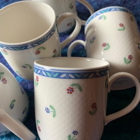 7 kpl Villeroy & Boch mukeja, joissa monivärinen kukkakuviointi valkoisella pohjalla. Mukit ovat posliinia tai vastaavaa keraamista materiaalia ja niissä on vihreä reunus kupin yläreunassa.