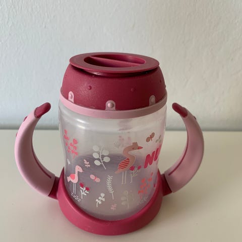 Lässigin nokkamuki, jossa silikoninen kansi/nokka ja muovinen mukiosa. Kestää pesun astianpesukoneessa ja lämmityksen mikrossa. Pohjan liukuesteessä yhdessä kohti pieni rikkouma (ks. kuva), muuten ei moitteita.