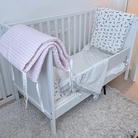 IKEA Gonatt valkoinen pinnasänky ja Krummelur vaahtomuovipatja. Koko 60*120 cm. Sängyssä on sälepohja ja irrotettava laidallinen etusivu, jolloin sänkyä voi käyttää sekä perinteisenä pinnasänkynä että avoimena lastensänkynä. Sängyn alla on erillinen taso ja kolme vetolaatikkoa.