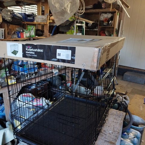 Trekker kahden koiran kuljetushäkki . Mitat ovat noin leveys 89 x lattian pituus 69 x korkeus 50 cm. Häkissä on ritilärakenne ja useita lukittavia kiinnityspisteitä. Sopii koiran kuljettamiseen ja tilapäiseen majoittamiseen esimerkiksi autossa tai sisätiloissa. Useamman vuoden vanha, mutta ei ole kasattu koskaan, vain oviseinä ollut hetken kiinnitettynä auton takakonttiin. Viimeinen kuva on mallikuva kootusta häkistä. VAIN NOUTO Tuusulasta