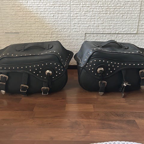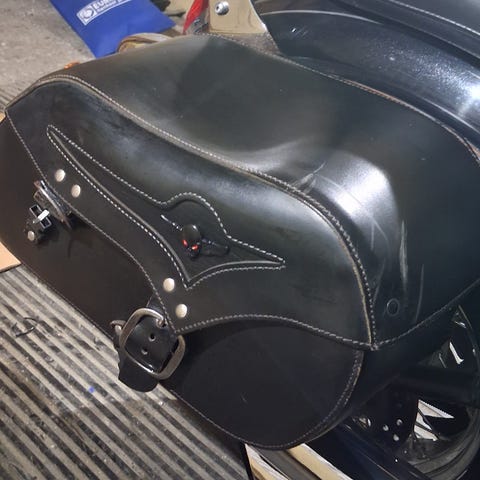 Custom-sivulaukut moottoripyörään. Kaksi kiinteästi toisiinsa yhdistettyä laukkua, jotka asettuvat satulan molemmille puolille. Materiaalina musta nahka, jossa vaalea tikkauksella tehty koristesauma. Laukuissa on kannet, jotka suljetaan hihnoilla ja soljilla. Yläosassa on kantokahvat helpottamaan laukkujen käsittelyä irrotettuna.