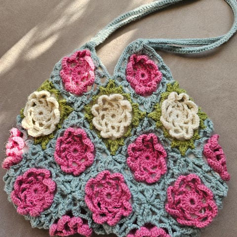 Räsymattokuteen päälle virkattu uniikki laukku/kassi