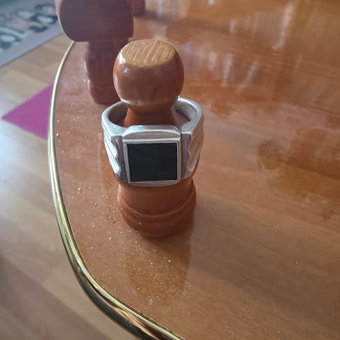 Hopeasormus vihertävällä kivellä, kiven materiaalista ei tietoa. 925 hopeaa. Koko noin 19,5
