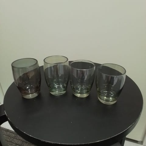 Pienet (korkeus 6cm) lasit. Nämä on 1960-luvulta mutta valmistajasta tai suunnittelijasta ei ole varmuutta. Lasi on haalean violetin sävyistä ja siinä on kohokuvioinen, ruudukkomainen pinta. Ohuet ja kevyet pikkulasit.