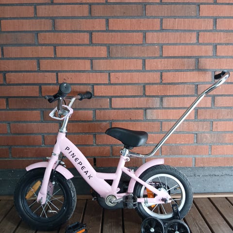 Hyväkuntoinen ensipyörä myyntiin isomman tieltä. Mukaan kuvassa näkyvät apurattaat sekä ohjaustolppa.