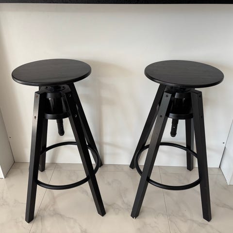 2 kappaletta mustia Ikean Dalfred jakkaroita. Jo elämää nähneet, istuinpinnassa sekä jaloissa jälkiä/kolhuja mutta yleisilme siisti, eikä pistä silmään. Molemmissa jakkaroissa korkeudensäätömekanismi toimii moitteettomasti! Nouto Tampere Vuores. Jakkaroiden ovh 120€