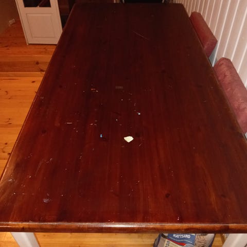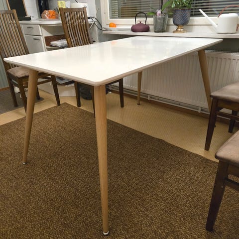 Hyväkuntoinen pöytä. Sopii moneen tarkoitukseen. Kertaalleen hiottu ja maalattu. Jalkoihin laitettu lisäjalat jotka saa pois halutessaan. Korkeus pöydällä ilman lisäjalkoja 74 cm. Vain nouto.