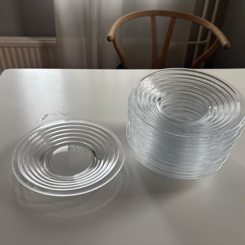 Timo Sarpanevan suunnittelemat lasilautaset. Väri lila, halkaisija noin 14 cm. Ehjät, hyvin vähän käytön jälkiä.