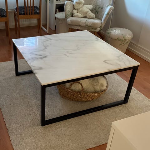 Tästä ehjä marmorin värinen sohvapöytä. Ei muistikuvaa, mistä ostettu. Ollut käytössä noin. Vuoden meillä.