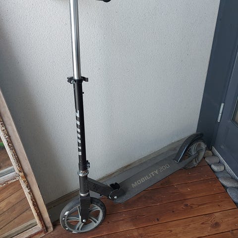 Potkulauta, jossa suuret renkaat ja säädettävä ohjaustanko. Väritys musta ja harmaa sinisillä yksityiskohdilla. Sopii liikkumiseen tasaisilla alustoilla, kuten jalkakäytävillä ja piha-alueilla. Potkulaudassa on jalkaosa, ohjaustanko käsikahvoilla sekä taittomekanismi kuljetusta ja säilytystä varten.