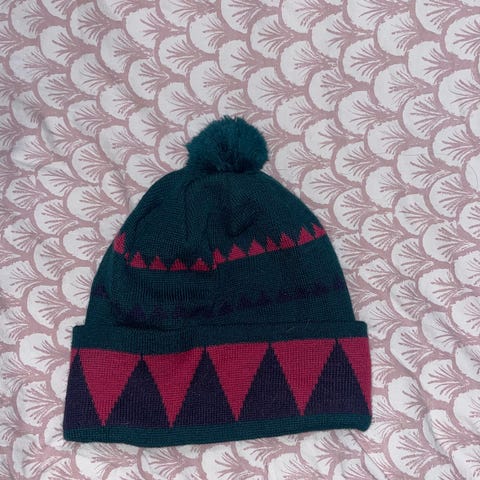 Käsintehty, käyttämätön. Sopii isompaankin päähän, kangas joustava. Lleveys 27cm js korkeus tupsun alle 26cm.