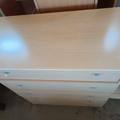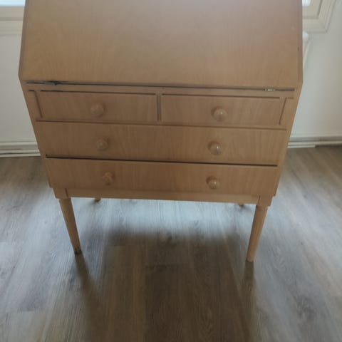 Vaalean beige puinen lipasto, jossa on kaksi laatikkoa. Pinnassa on kulumaa sekä jälkiä, jotka näkyvät kuvissa. Sopii esimerkiksi makuuhuoneeseen yöpöydäksi tai pieneen tilaan säilytys- ja laskutasoksi. Mitat näkyvät kuvissa. Pientä laittoa ehkä vaatii. (Tai asettaa pöydälle jonkin peittävän "liinan" niin ei tarvitse edes maalata ;))