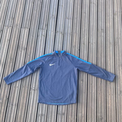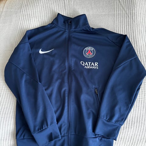 Nike jalkapallotakki juniorille, koko 140 cm. Väri tummansininen. Takissa on huppu, vetoketjukiinnitys ja sivutaskut. Rinnassa on joukkueen logo ja numero 53. Sopii jalkapalloharjoituksiin ja muuhun ulkoliikuntaan lapselle.