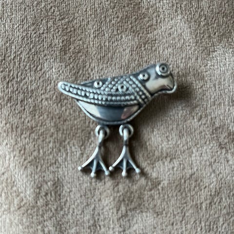 Hopeinen Kalevala lintunen rannekoru. Halkaisija 50mmx60mm. MMM
