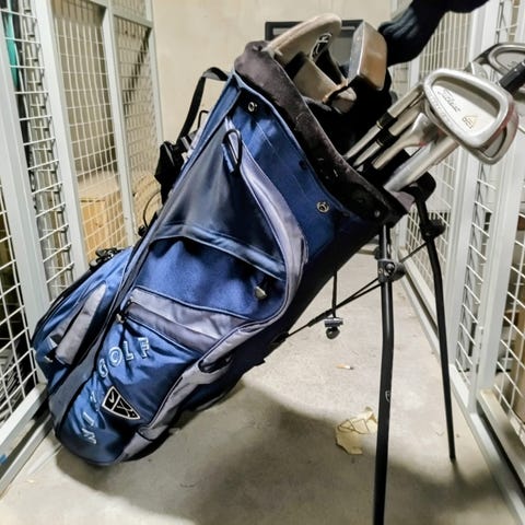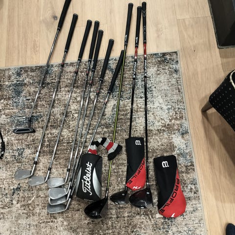 Aikuisten oikeakätisen Wilson golfmailasetti rautamailoilla (5, 6, 7, 8, 9, P ja S) sekä putteri. Käytön jälkiä pieninä pintanaarmuina. Gripit hyvässä kunnossa. Bägissä kantohihna ja useita taskuja, mutta bägin seisontatuki on rikki. Settiin kuuluu myös muovipussillinen golfpalloja sekä joitakin tiitä. Ihan kelpo pakkaus golfharrastuksen aloittamiseen.