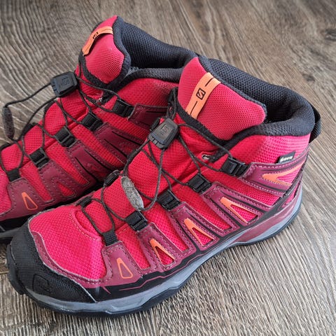 Salomon lasten vaelluskengät, koko 36, unisex-malli. Kengät ovat siniset, joissa on kontrastivärisiä yksityiskohtia ja musta vahvistettu kärki sekä kanta. Pohjassa on karkea kuviointi, joka on suunniteltu tarjoamaan pitoa epätasaisilla alustoilla. Kengissä on nilkkaa tukeva varsi ja pikasäätöinen nauhoitus. Soveltuvat ulkoiluun ja vaellukseen lapsille ja nuorille.