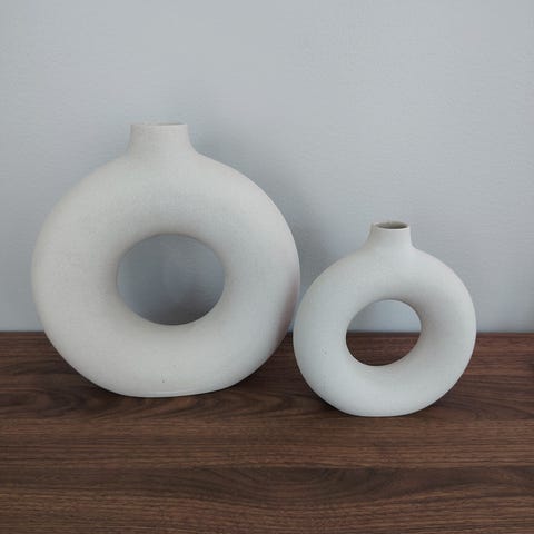 Näyttävät vaaleat maljakot. Ehjiä molemmat. Vaikka ovat saman kokoisena ostettu, ovat silti hieman erikokoiset, muotoiset ja väriset.