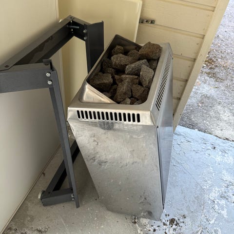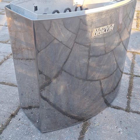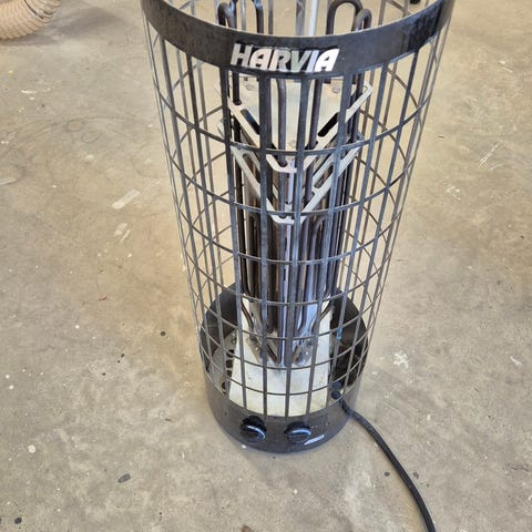 Harvia sähkökiuas 6kW saunaan. Seinälle asennettava malli (kiinnikkeet mukana), musta ulkokuori. Kiukaassa on kiinteät säätönupit alaosassa lämpötilan ja ajastuksen säätöön. Soveltuu käytettäväksi sähkösaunassa valmistajan ohjeiden ja saunan tilavuuden mukaan. Rakenne metallia, ulkopinta maalattu. Kiuas liitetään sähköverkkoon asianmukaisen sähköasennuksen kautta. Vm. 2008, hyvin vähällä käytöllä ollut.