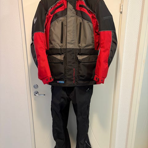 Takissa on korkeahko kaulus, vetoketju ja nepparikiinnitys sekä säädettävät hihat. Takissa suojat olka- ja kyynärpäissä sekä selässä perus pehmustava suoja. Housuissa on säädettävät henkselit ja vyötärön kiristys sekä lonkka- ja polvisuojat. Käsitykseni mukaan molemmat ovat myös vettäpitäviä Sopii moottoripyöräkäyttöön tai muuhun ajovarustekäyttöön säältä suojaavana ajovarusteena.