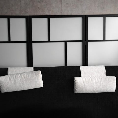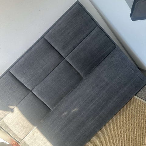 Myydään harmaa hyväkuntoinen sängynpääty, jossa on taittuvat nojatyynyt mekanismilla.