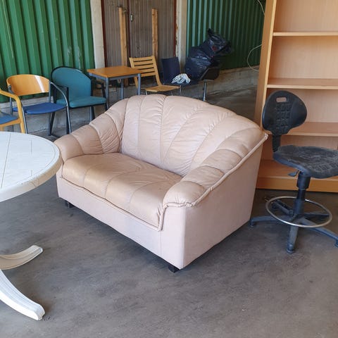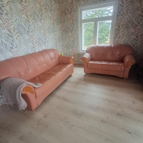 Laadukas, pehmeää nahkaa. Ryhdikäs kalusto joka ei uudemmankan rinnalla häpeä. Lepotuoli on tukeva ja käsinojien kera noin metrin leveä. Sijainti on Vuorilahdessa Viitasaaren puolella.
