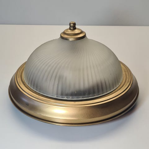 Kattovalaisin, jossa valkoinen, uurteinen lasikupu ja messinkisävyinen metallireunus. 10 €.