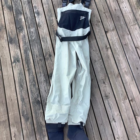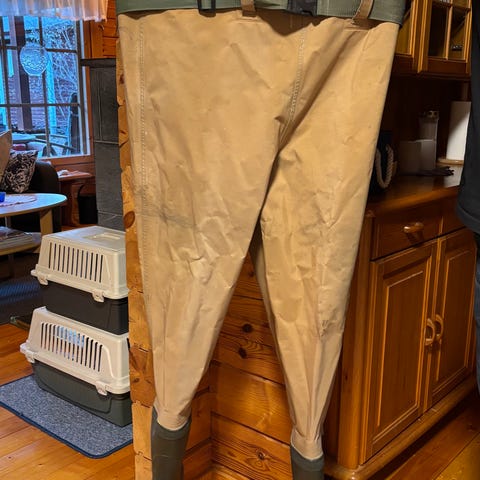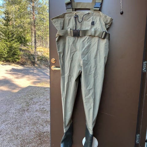 Käyttämättömät kahluuhousut, joissa kiinteät kumisaappaat. Väriltään harmaa yläosa ja mustat saappaat. Saappaiden koko on 43. Housuissa on säädettävät olkaimet ja etutasku. Sopivat esimerkiksi kalastukseen, mökkipuuhiin ja muuhun vedessä liikkumiseen. Sanoisin, että sopii 170-185 pituiselle..