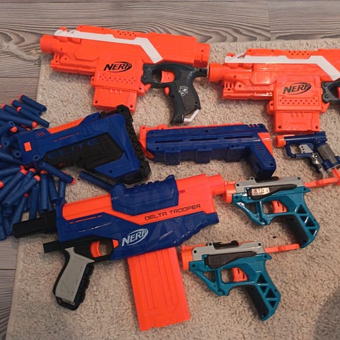 Nerf leikkipyssysetti, osa toimii jotenkin ja osa rikki. Mukana 3 kpl 6 ammuksen ja 1 kpl 12 ammuksen lippaita.