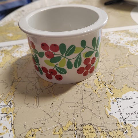 60-luvulla tehty mansikkapurkku tarjolla. Ei kantta. Ihan pieni pala lähtenyt pohjasta, ei haittaa käyttöä. Korkeus 6cm, vetoisuus reilu 2 dl