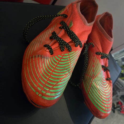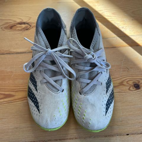 Adidas Predator jalkapallokengät. Koko EU 34 Väri musta punaisilla ja valkoisilla yksityiskohdilla. Nauhakiinnitys. Sopivat jalkapallon pelaamiseen, esimerkiksi keinonurmelle tai kovalle alustalle mallista riippuen. Valmistusmaa Vietnam, merkinnät sisävuoressa.