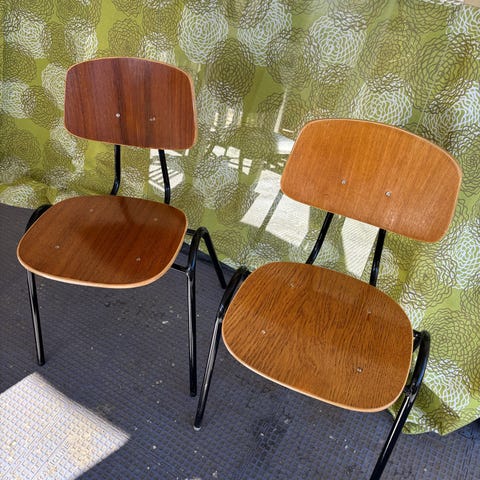 Vanha vihreä tuoli metallijaloin. Kolhuja ja kulumaa on. Yleisilmeeltään silti siisti ja tukeva. Nouto.