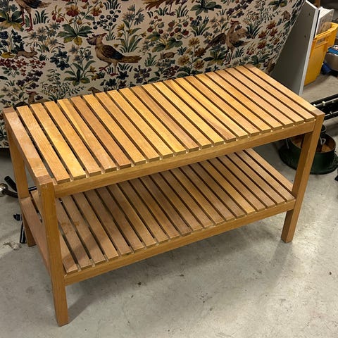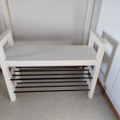 Todella kulunut jälkiä täynnä oleva musta eteispenkki/kenkäteline/säilytyskaluste. Ollut lasiterassilla. Suoraan käytöstä. Likaa pinnassa. Huomioitu hinnassa.